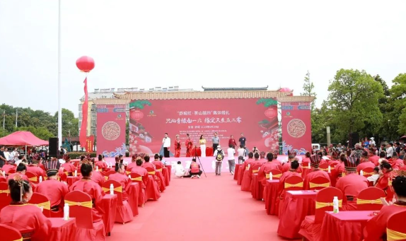 5月20日上午,我县举办“舒城红·茶山囍约”集体婚礼活动。六安市民政局副局长宣兴中,县领导汪健、胡久松、张栋梁、朱传旭等出席活动。在舒茶镇九一六文化活动广场,50对新人完成了一场中式集体婚礼,进行了亲迎却扇、互换信物、三拜、结发礼、合卺酒等环节,现场洋溢着浓浓的喜庆氛围。活动中,金婚、银婚、新婚夫妇代表分别分享了他们的爱情故事,新人代表宣读了《抵制高价婚礼 倡导婚俗新风》倡议书。仪式结束后,新人们来到舒茶镇石塘村,认领爱情树,挂上认领牌,锁上爱心锁。